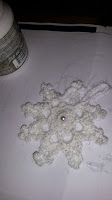 ❄Hiernaast 2 foto's terwijl ik het drenk met textielverharder. Dat voelde heel gek: alsof ik nu mijn haakwerk aan het verpesten was. Vooral omdat de witte lijm pas doorzichtig wordt als het droogt... Was wel ff spannend hoor!Als laatste nog een foto waar die klaarligt om te verharden en helemaal onderaan heb ik geprobeerd met een piepklein parelkraaltje (maar die was toch ff te klein en vond ik niet zo mooi).
