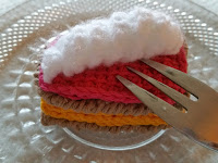 Onlangs heb ik het opnieuw gemaakt. Daarbij heb ik wat dingetjes aangepast: 1) de banketbakkersroom heb ik geler gemaakt dan deze hier, 2) bij het omranden van het koekje heb ik in de hoekjes steeds 2x kreeftensteek gehaakt, 3) bij het omranden van het glazuur heb ik in de hoekjes steeds 1hv + 1losse + 1hv gehaakt 4) banketbakkersroom is een enorm gedoe met die kleine strookjes dus daar heb ik 1 lapje van gemaakt (15l+1kl+15v en dan een rij of 30?? Oeps, vergeten te tellen...), toen dicht genaaid nadat ik 'm had gevuld met fiberfill...